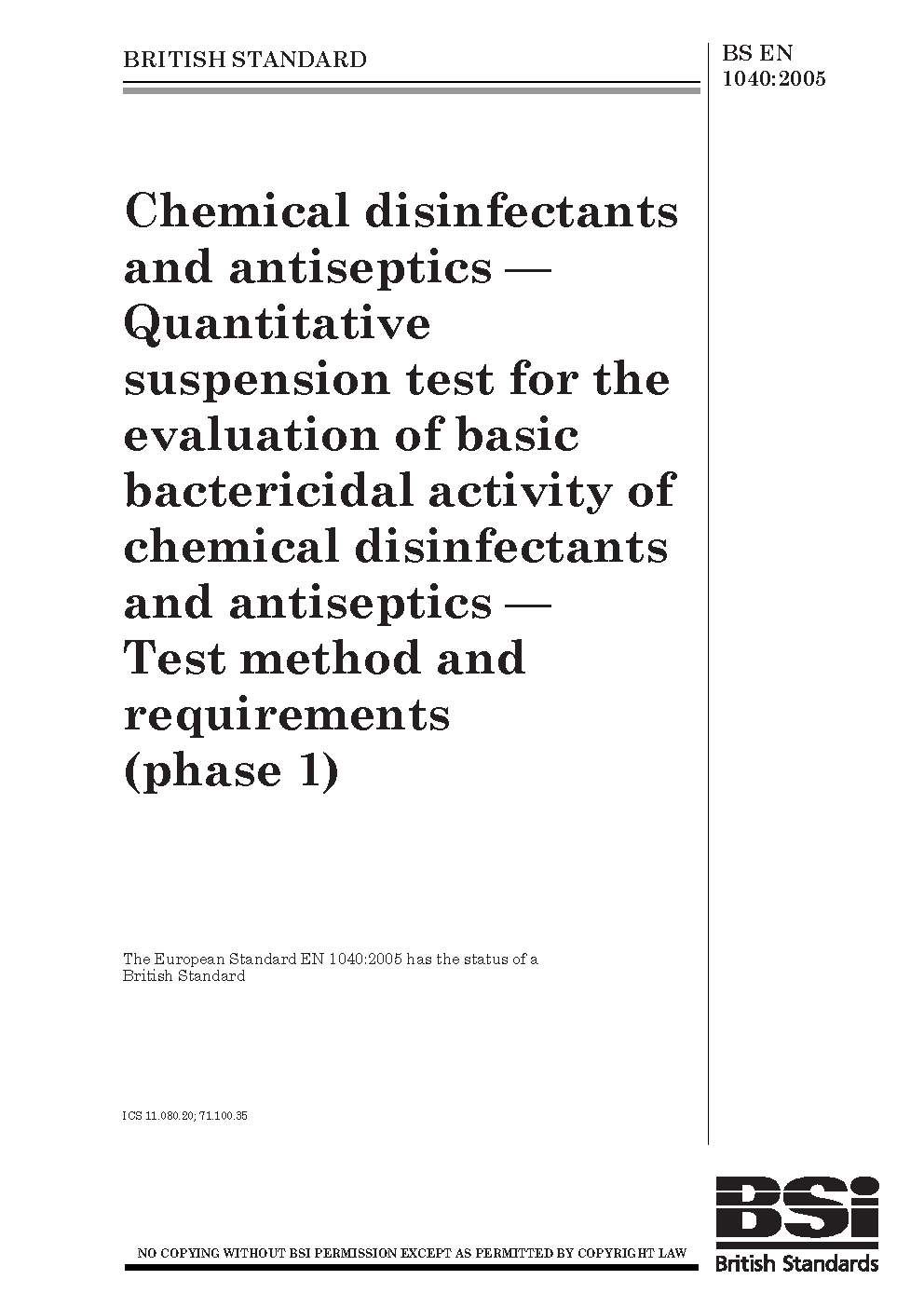 Chemical disinfectants and antiseptics. Quantitative suspension test for the evaluation of basic bactericidal activity of chemical disinfectants and antiseptics. Test method and requirements (phase 1)
