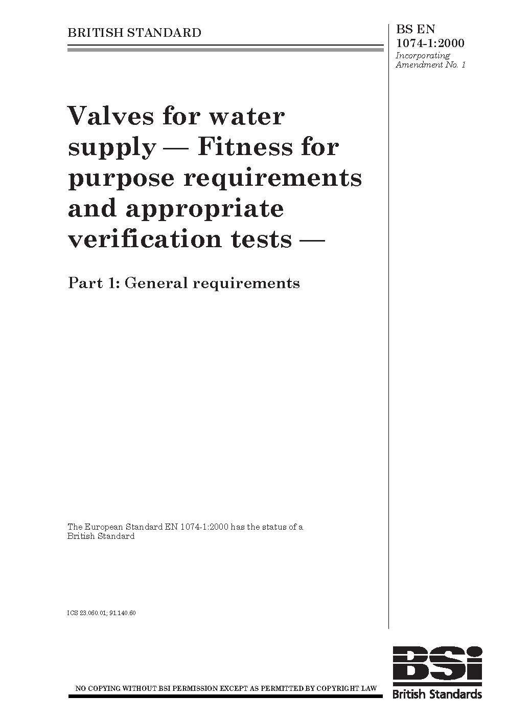 Valves for water supply. Fitness purpose requirements and appropriate verification tests General