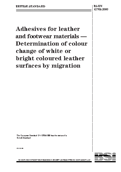 Adhesives for leather and footwear materials. Determination of colour change of white or bright coloured leather surfaces by migration