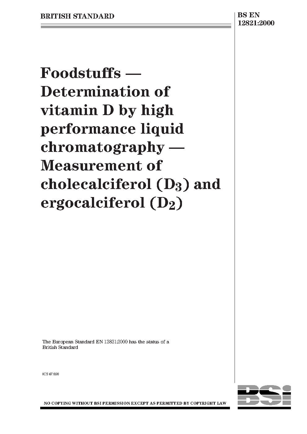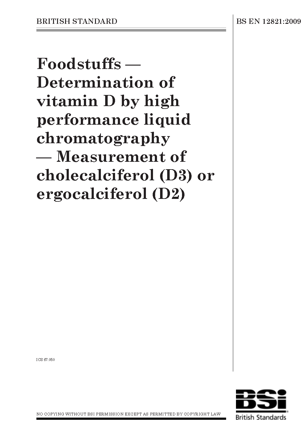 Foodstuffs. Determination of vitamin D by high perfomance liquid chromatography. Measurement of cholecalciferol (D3) and ergocalciferol (D2)