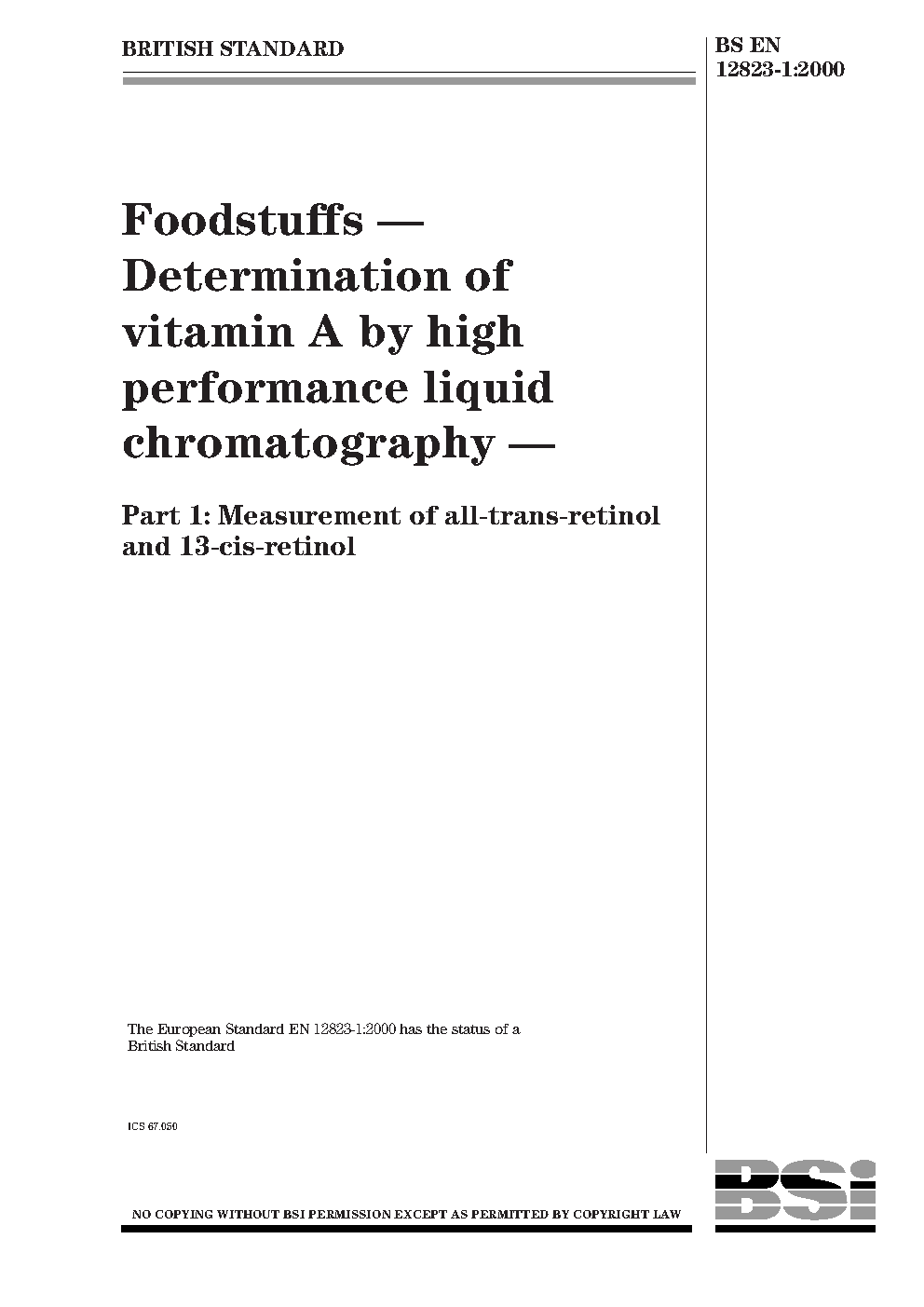 Foodstuffs. Determination of vitamin A by high performance liquid chromatography Measurement all-trans-retinol and 13-cis-retinol