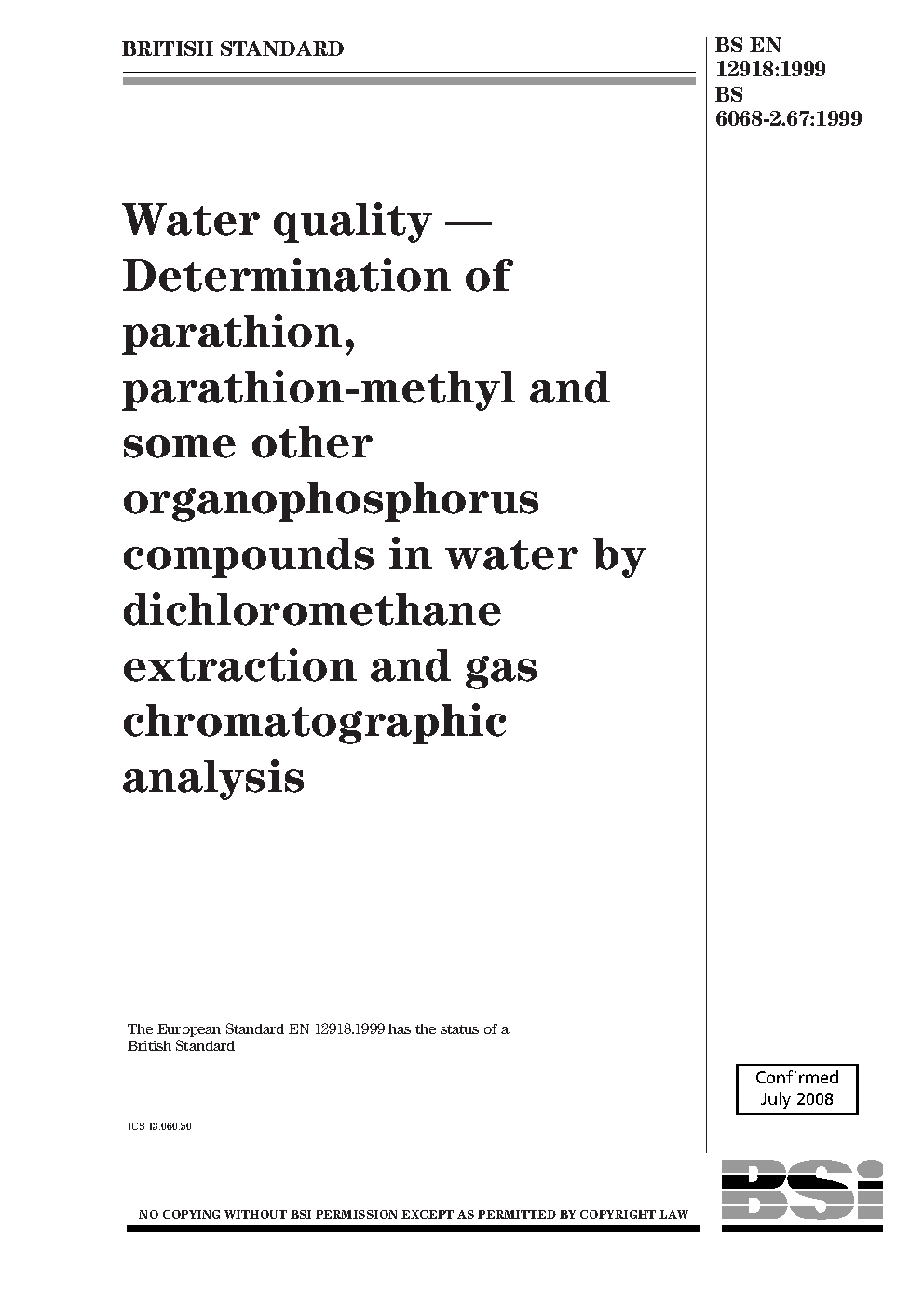 Water quality. Determination of parathion, parathion-methyl and some other organophosphorus compounds in water by dichloromethane extraction and gas chromatographic analysis