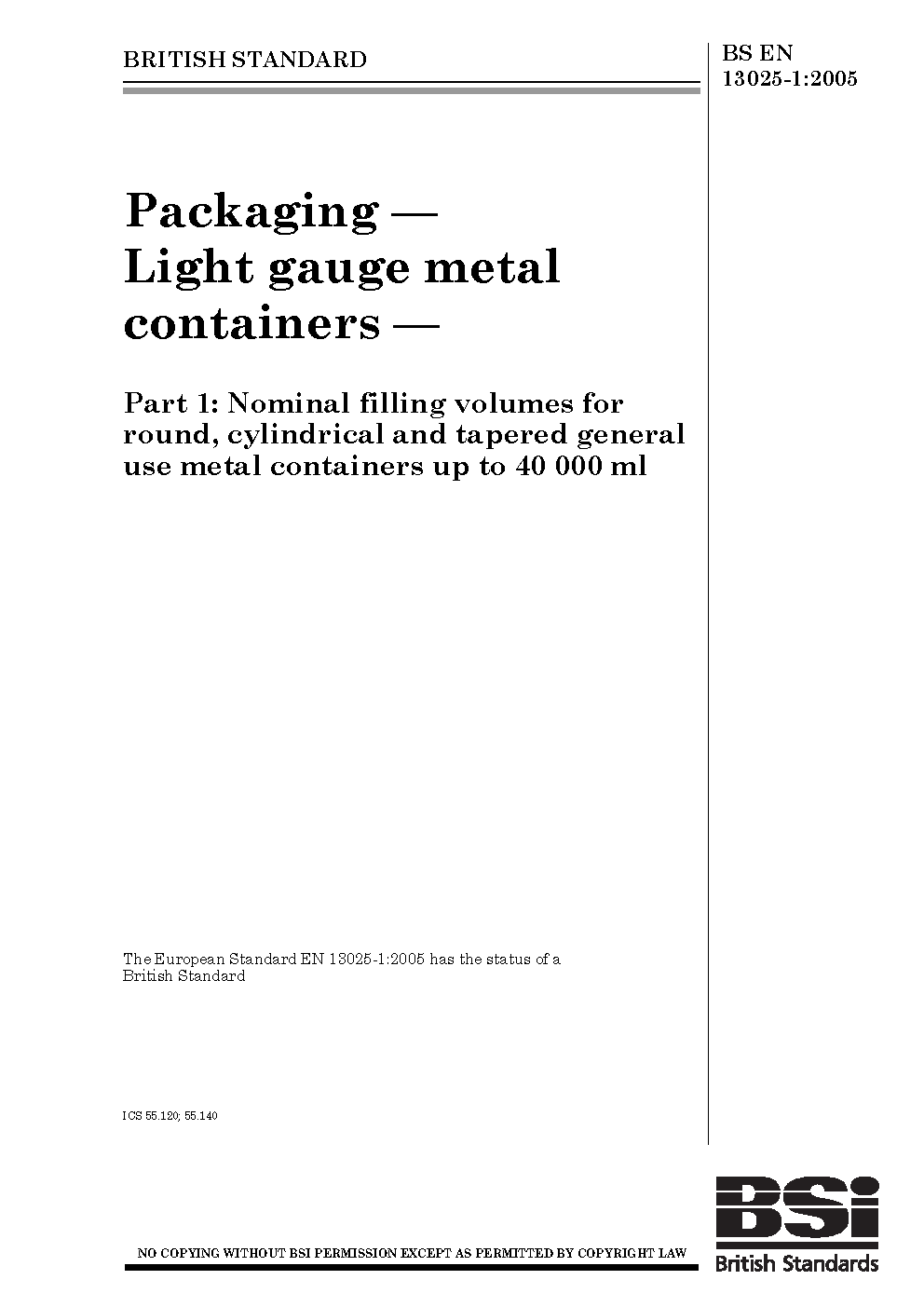 Packaging. Light gauge metal containers Nominal filling volumes for round, cylindrical and tapered general use up to 40000 ml