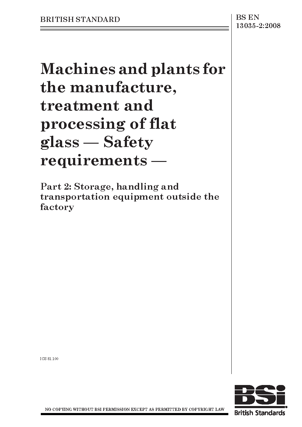 Machines and plants for the manufacture, treatment processing of flat glass. Safety requirements Storage, handling transportation equipment outside factory