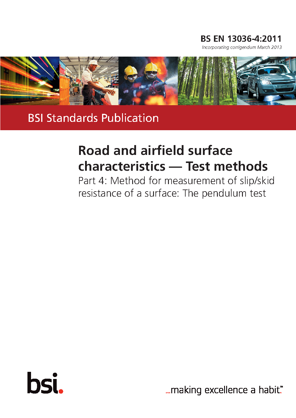 Road and airfield surface characteristics. Test methods Method for measurement of slip/skid resistance a surface: The pendulum test