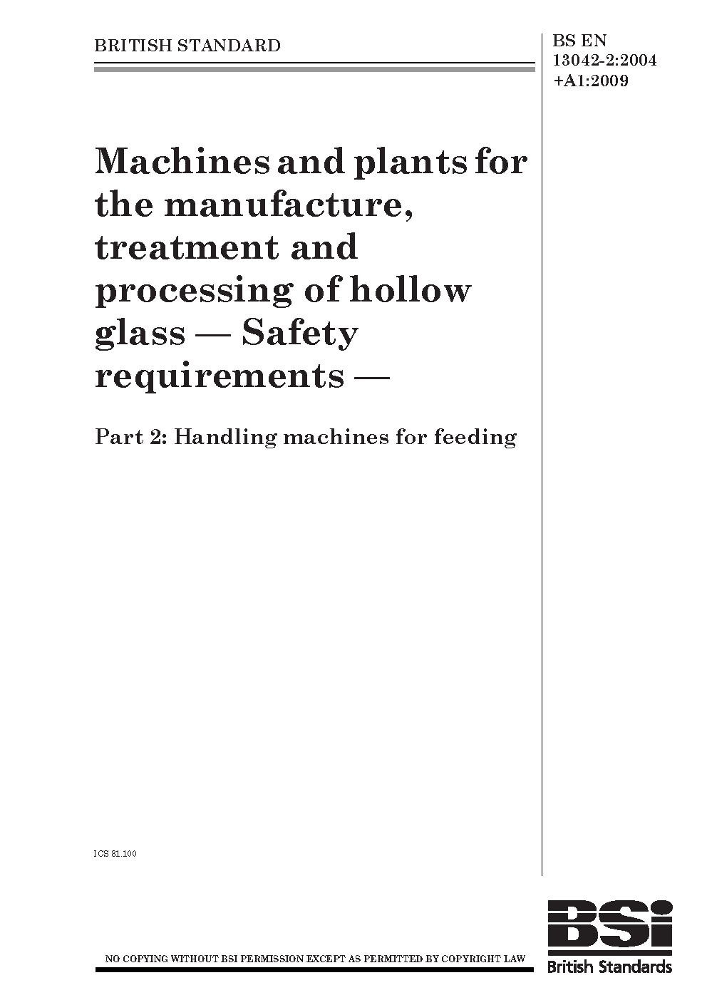 Machines and plants for the manufacture, treatment processing of hollow glass. Safety requirements Handling machines feeding