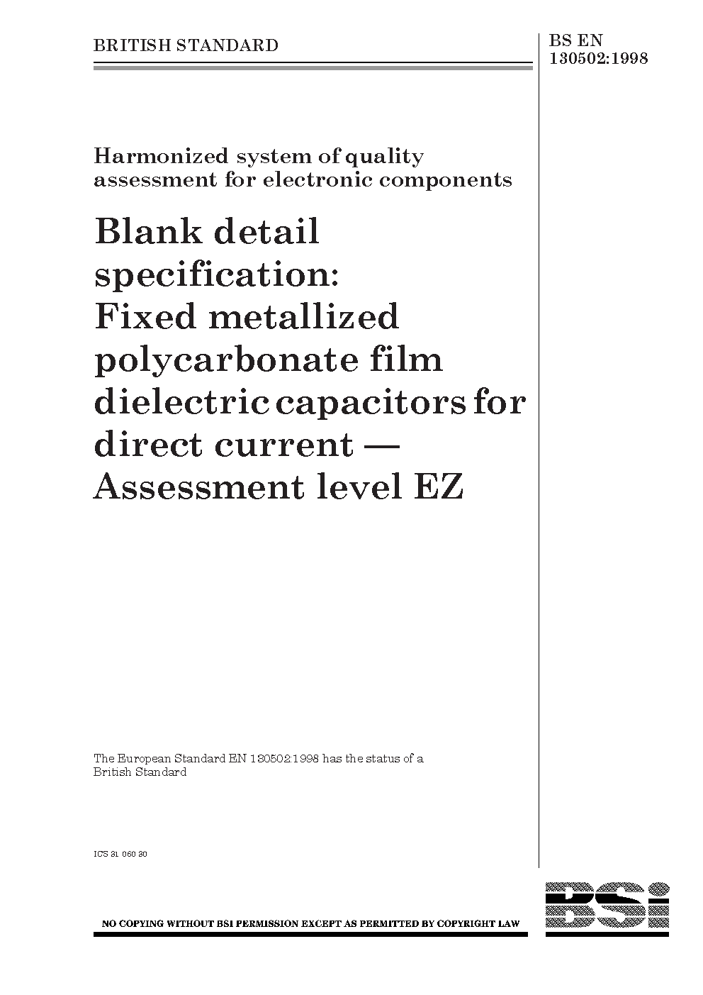 Harmonized system of quality assessment for electronic components. Blank detail specification: fixed metallized polycarbonate film dielectric capacitors for direct current. Assessment level EZ