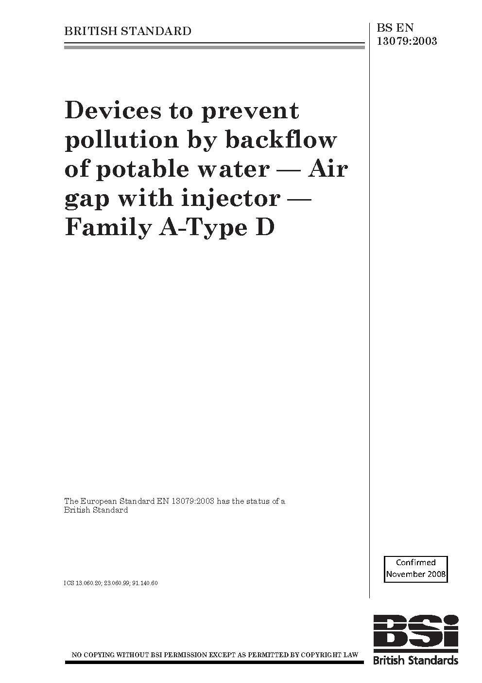 Devices to prevent pollution by backflow of potable water. Air gap with injector. Family A. Type D