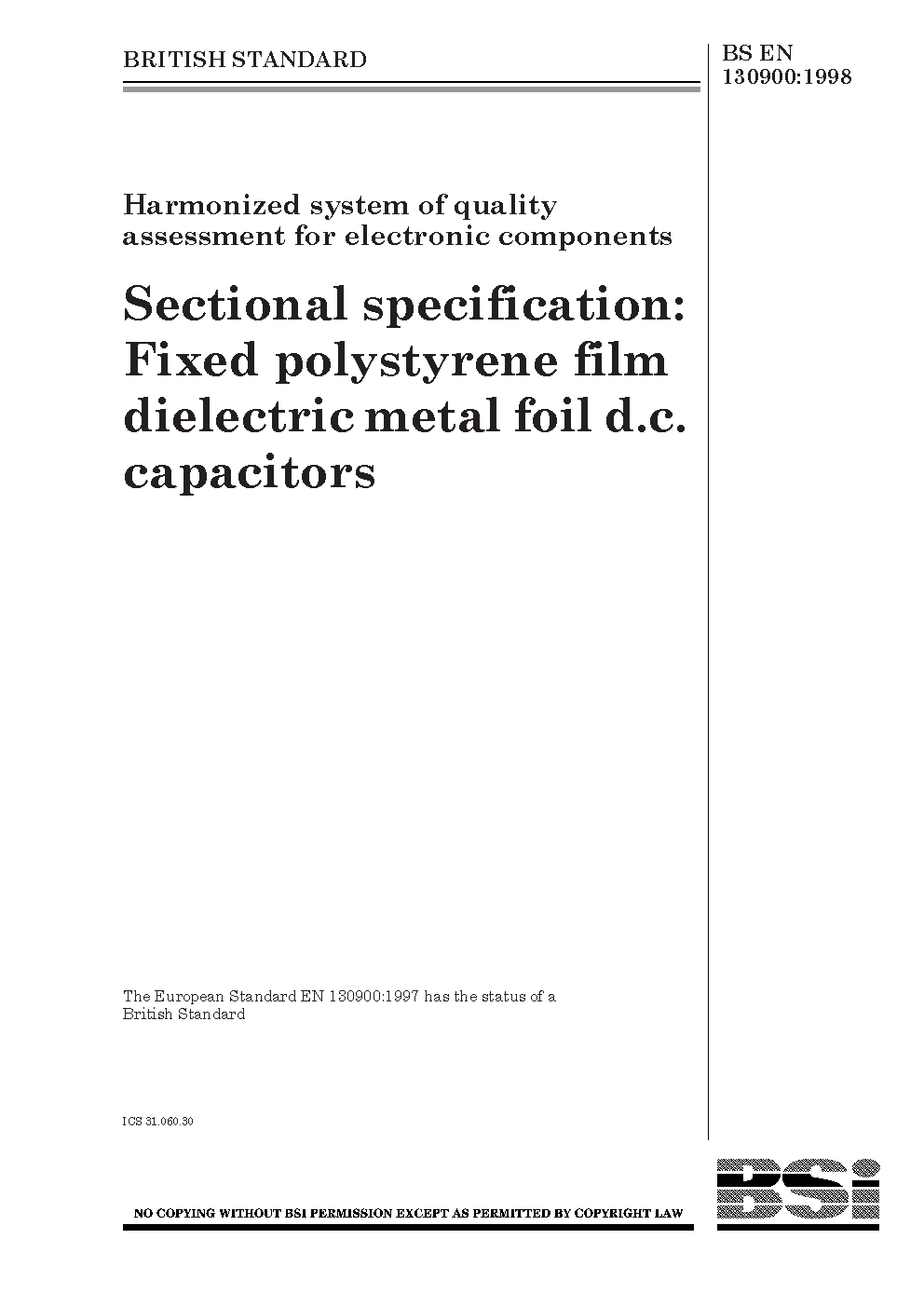 Harmonized system of quality assessment for electronic components. Sectional specification: fixed polystyrene film dielectric metal foil d.c. capacitors