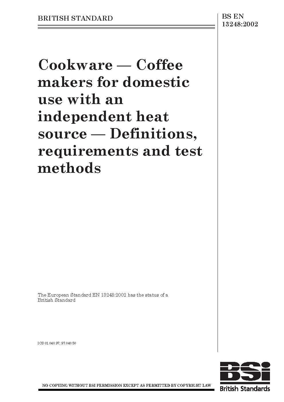 Cookware. Coffee makers for domestic use with an independent heat source. Definitions, requirements and test methods