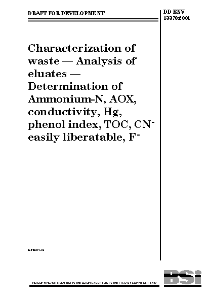 Characterization of waste. Analysis of eluates. Determination of Ammonium, AOX, conductivity, Hg, phenol index, TOC, easily liberatable CN-, F-