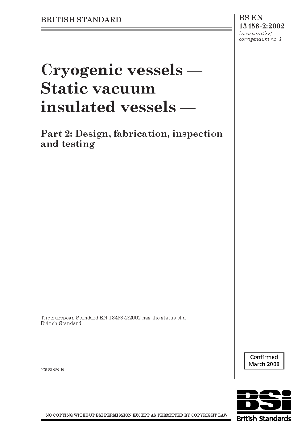 Cryogenic vessels. Static vacuum insulated vessels Design, fabrication, inspection and testing