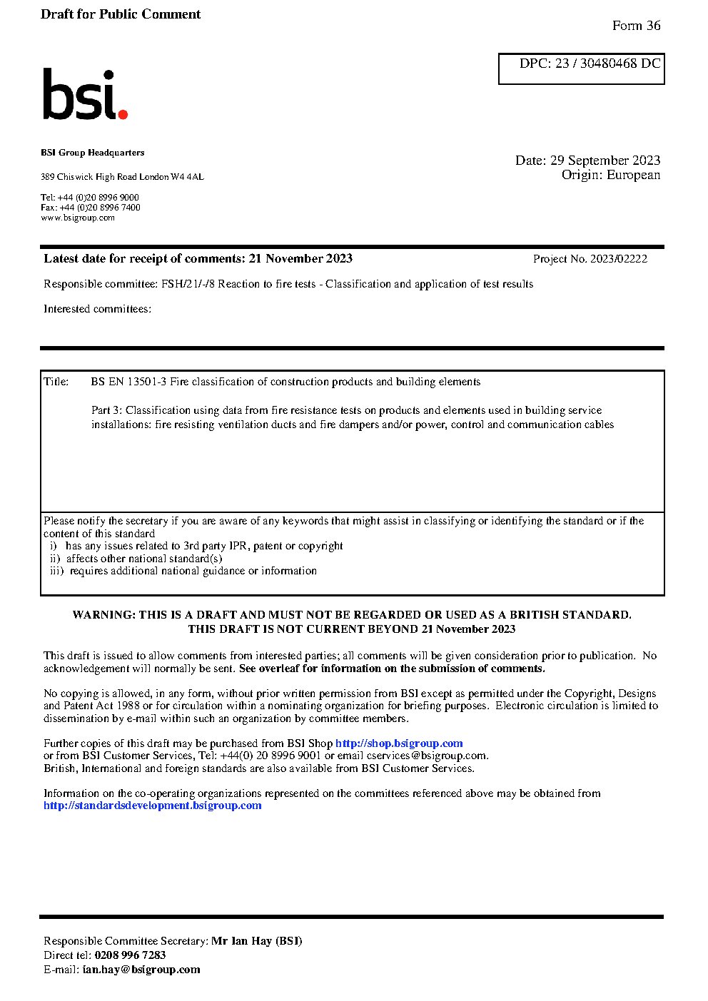 Fire classification of construction products and building elements Classification using data from fire resistance tests on used in service installations: resisting ventilation ducts dampers and/or power, control communication cables