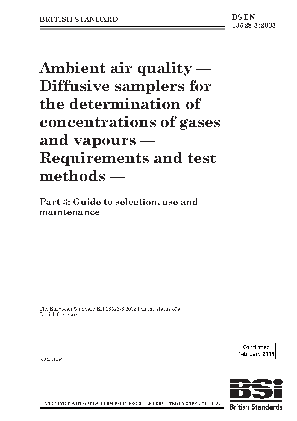 Ambient air quality. Diffusive samplers for the determination of concentrations gases and vapours. Requirements test methods Guide to selection, use maintenance
