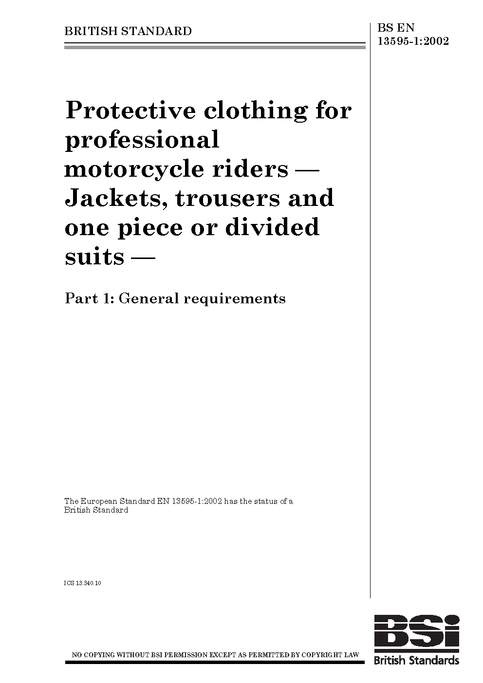 Protective clothing for professional motorcycle riders. Jackets, trousers and one piece or divided suits General requirements