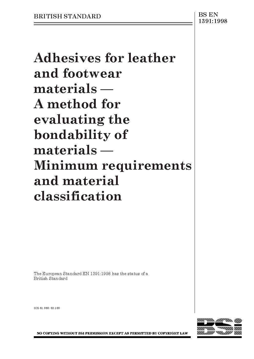 Adhesives for leather and footwear materials. A method for evaluating the bondability of materials. Minimum requirements and material classification