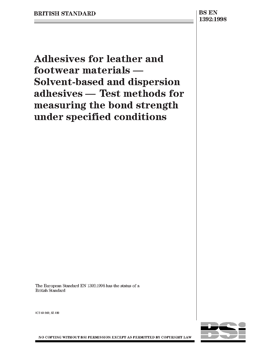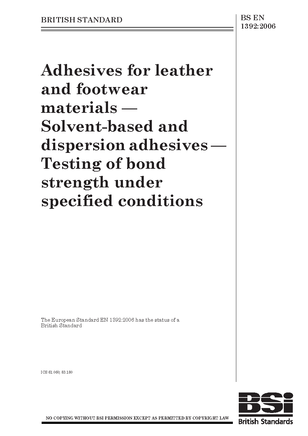 Adhesives for leather and footwear materials. Solvent-based and dispersion adhesives. Test methods for measuring the bond strength under specified conditions