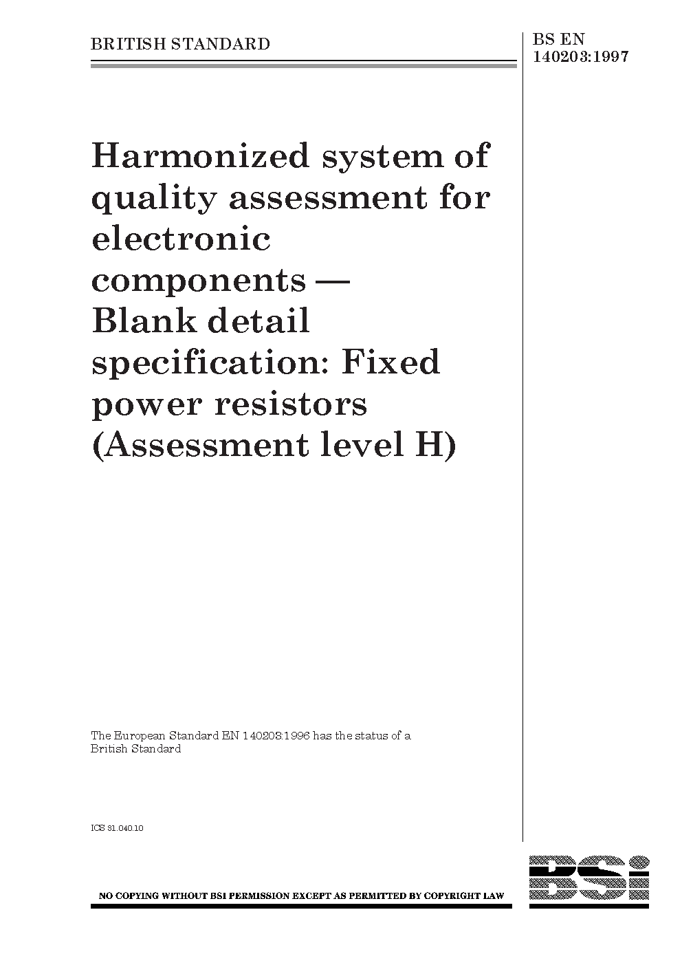 Harmonized system of quality assessment for electronic components. Blank detail specification: fixed power resistors (Assessment level H)