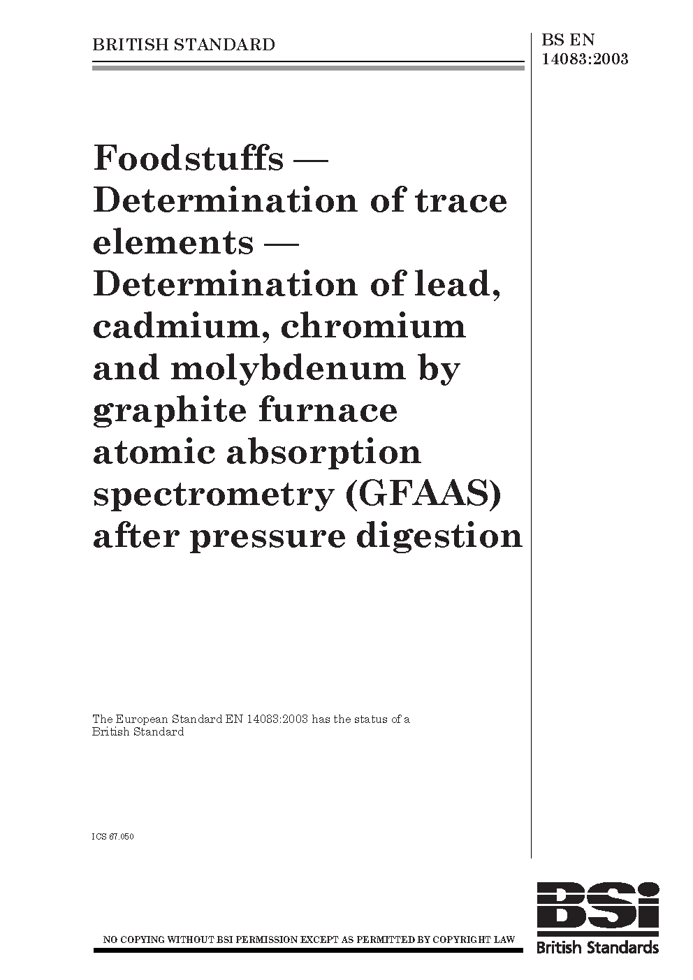 Foodstuffs. Determination of trace elements. Determination of lead, cadmium, chromium and molybdenum by graphite furnace atomic absorption spectrometry (GFAAS) after pressure digestion