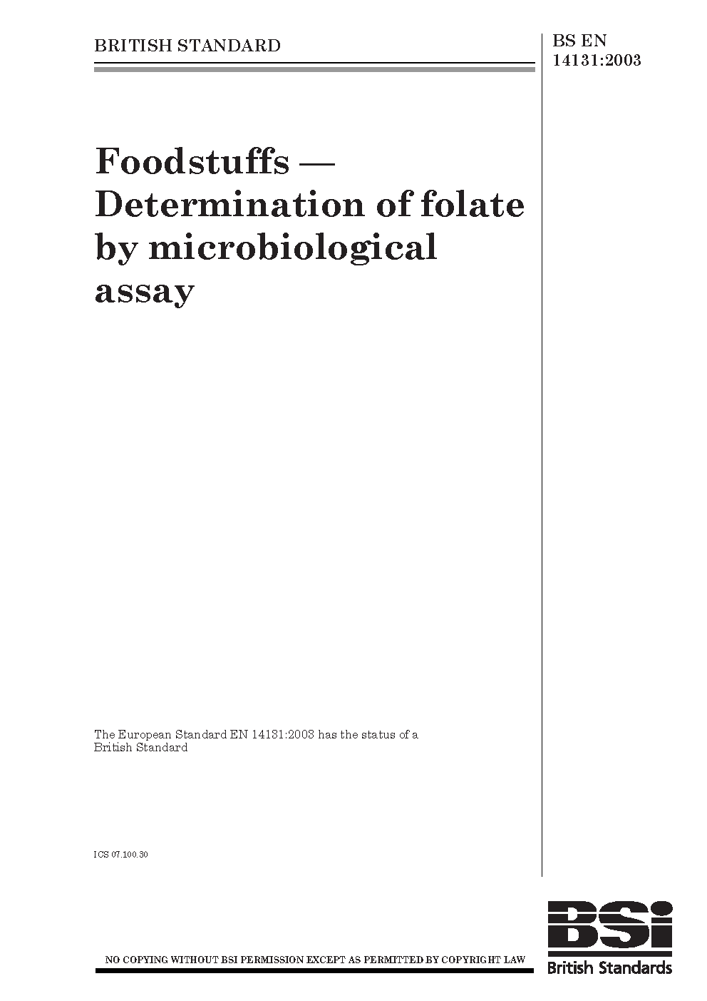 Foodstuffs. Determination of folate by microbiological assay