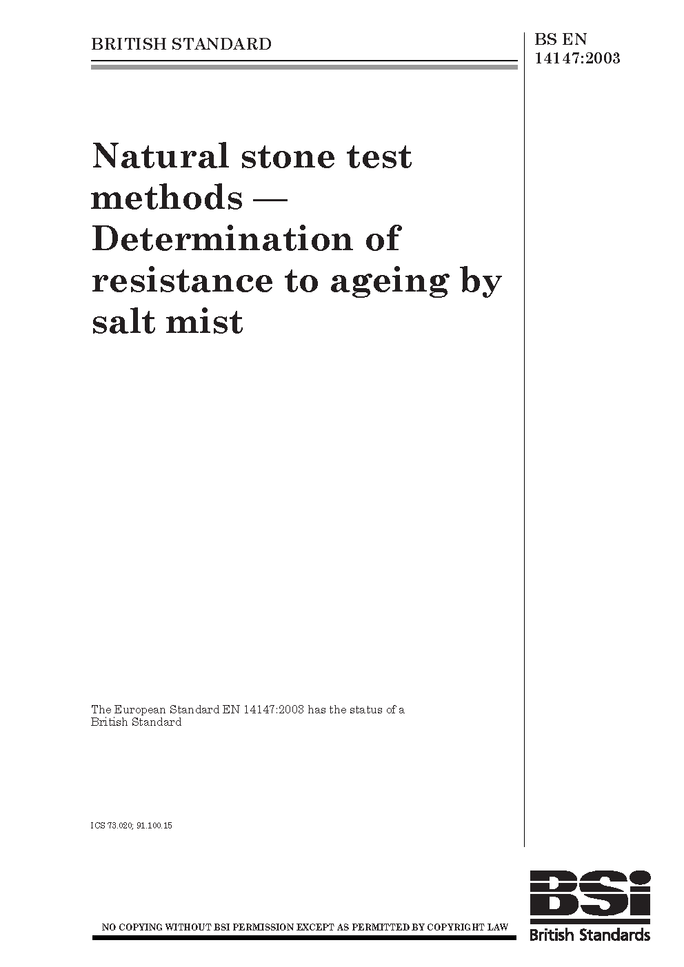 Natural stone test methods. Determination of resistance to ageing by salt mist
