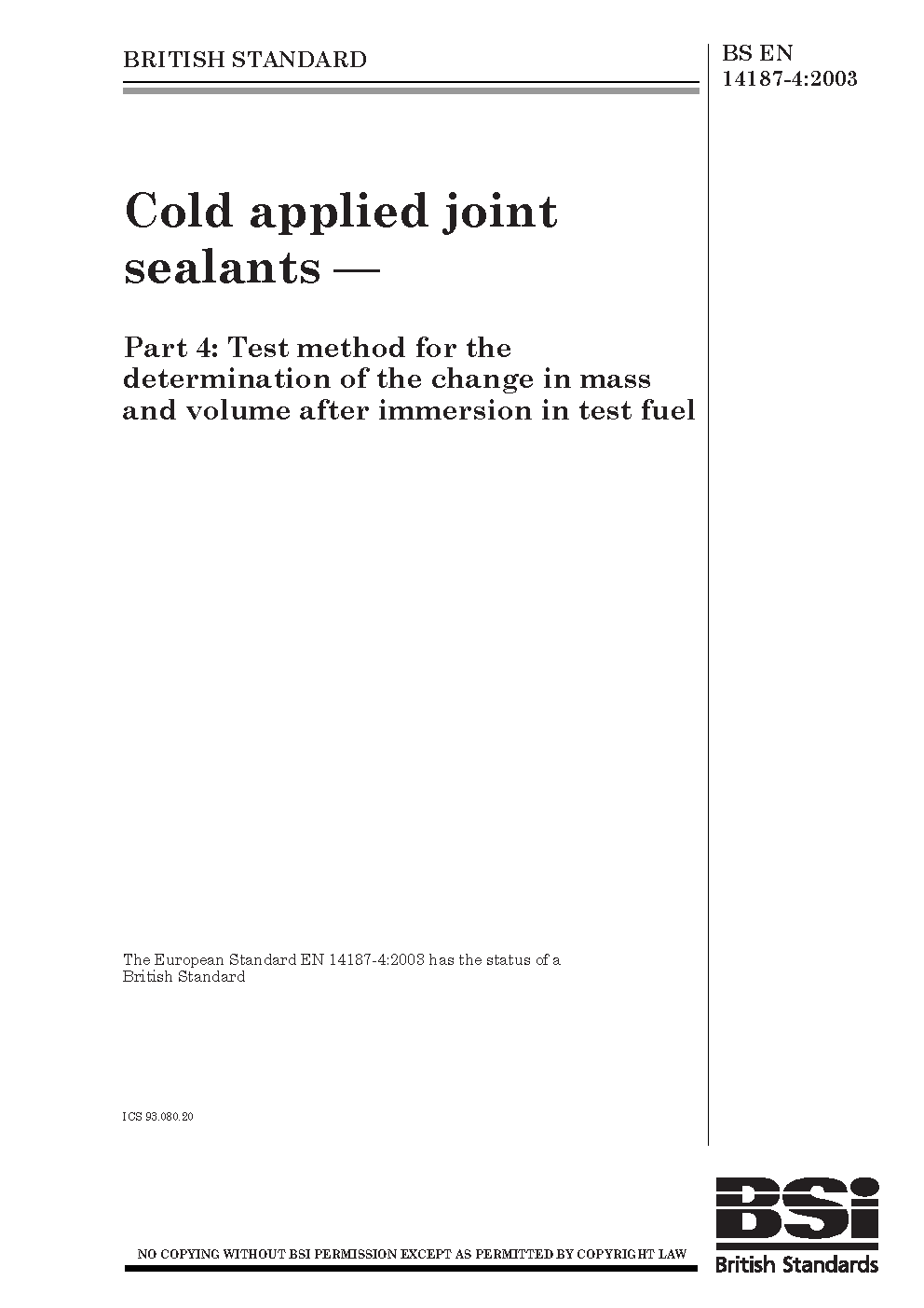 Cold applied joint sealants Test method for the determination of change in mass and volume after immersion test fuel
