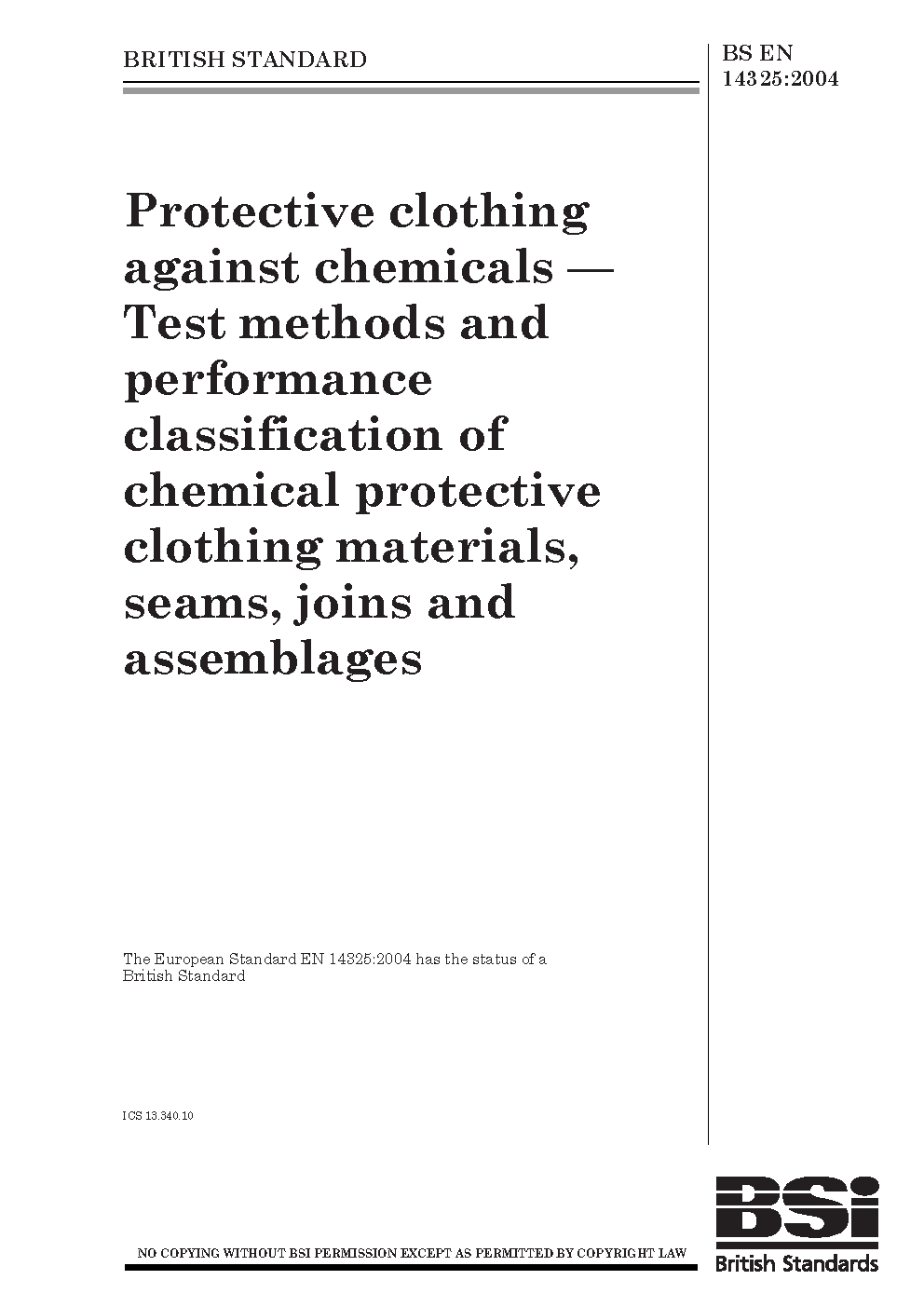 Protective clothing against chemicals. Test methods and performance classification of chemical protective clothing materials, seams, joins and assemblages