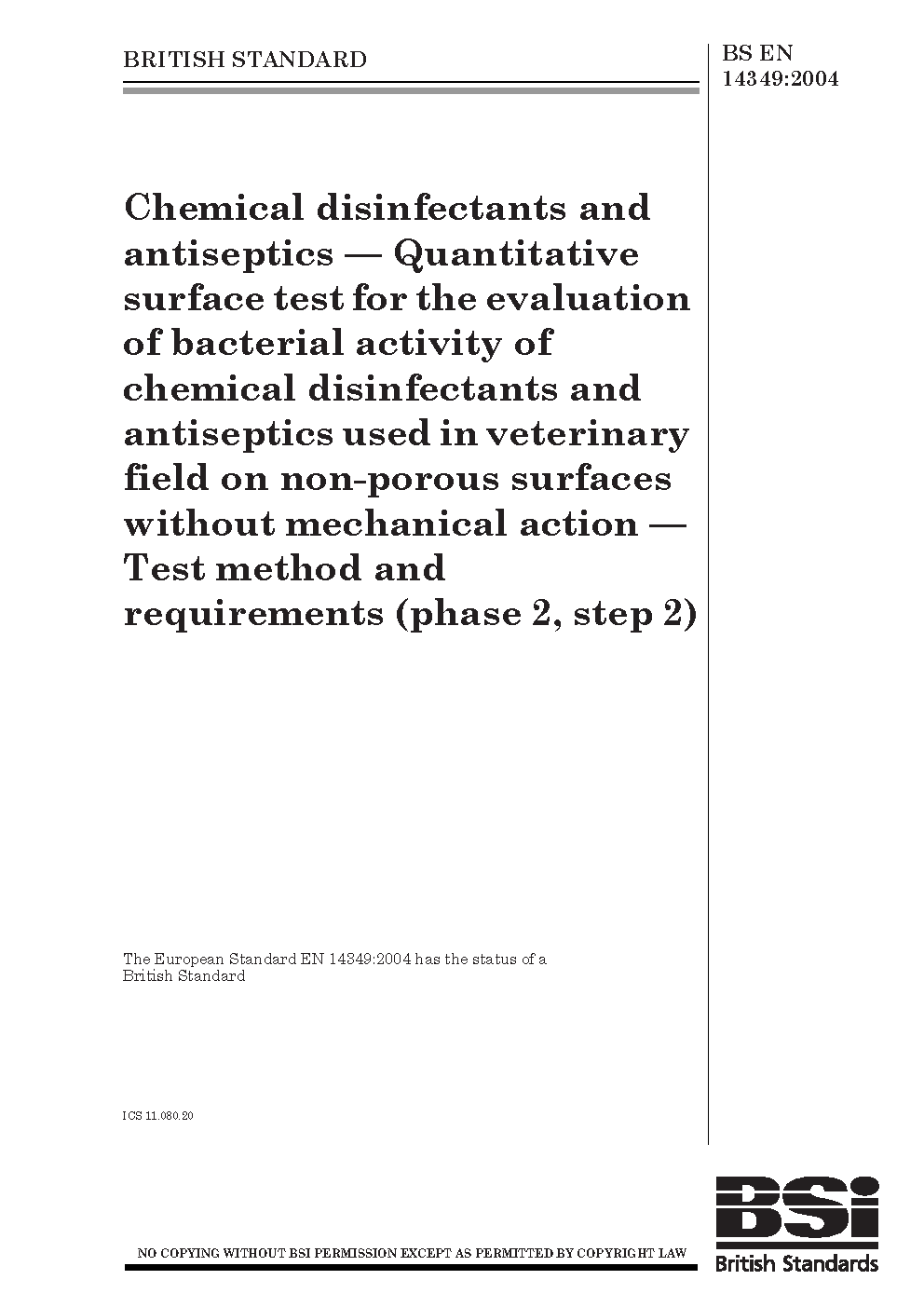 Chemical disinfectants and antiseptics. Quantitative surface test for the evaluation of bactericidal activity of chemical disinfectants and antiseptics used in veterinary area on non-porous surfaces without mechanical action. Test method and requirements (phase 2, step 2)