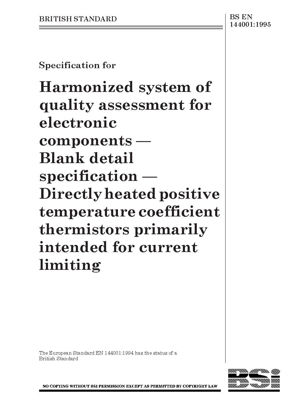 Specification for harmonized system of quality assessment for electronic components. Blank detail specification: directly heated positive temperature coefficient thermistors primarily intended for current limiting