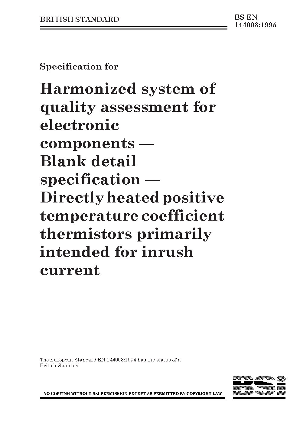 Specification for harmonized system of quality assessment for electronic components. Blank detail specification: directly heated positive temperature coefficient thermistors primarily intended for inrush current