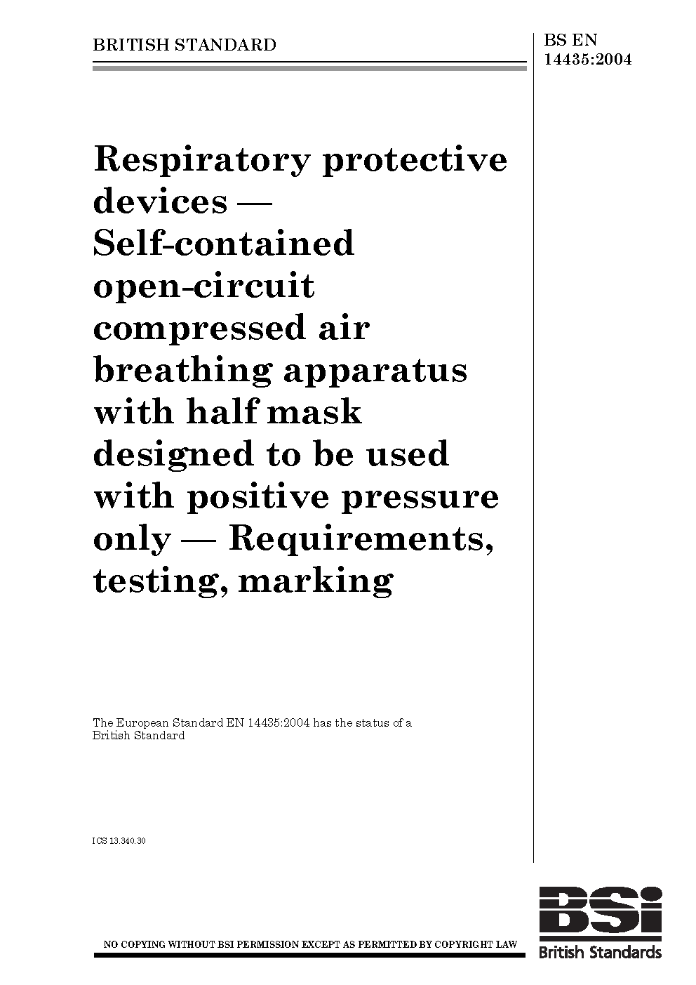 Respiratory protective devices. Self-contained open-circuit compressed air breathing apparatus with half mask designed to be used with positive pressure only. Requirements, testing, marking