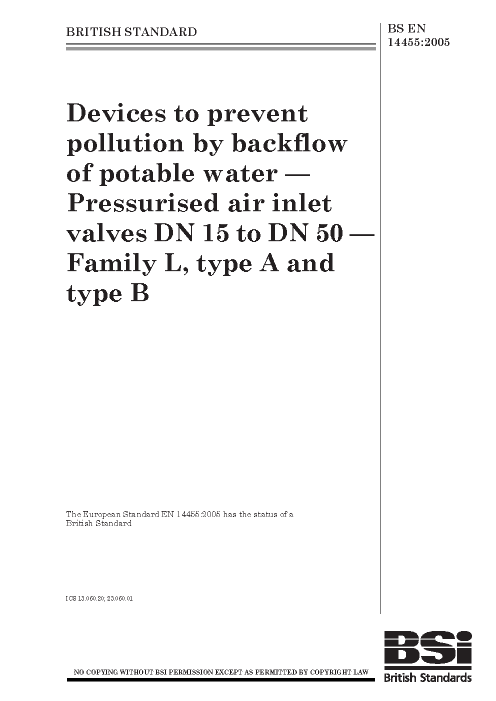 Devices to prevent pollution by backflow of potable water. Pressurised air inlet valves DN 15 to DN 50. Family L, type A and type B