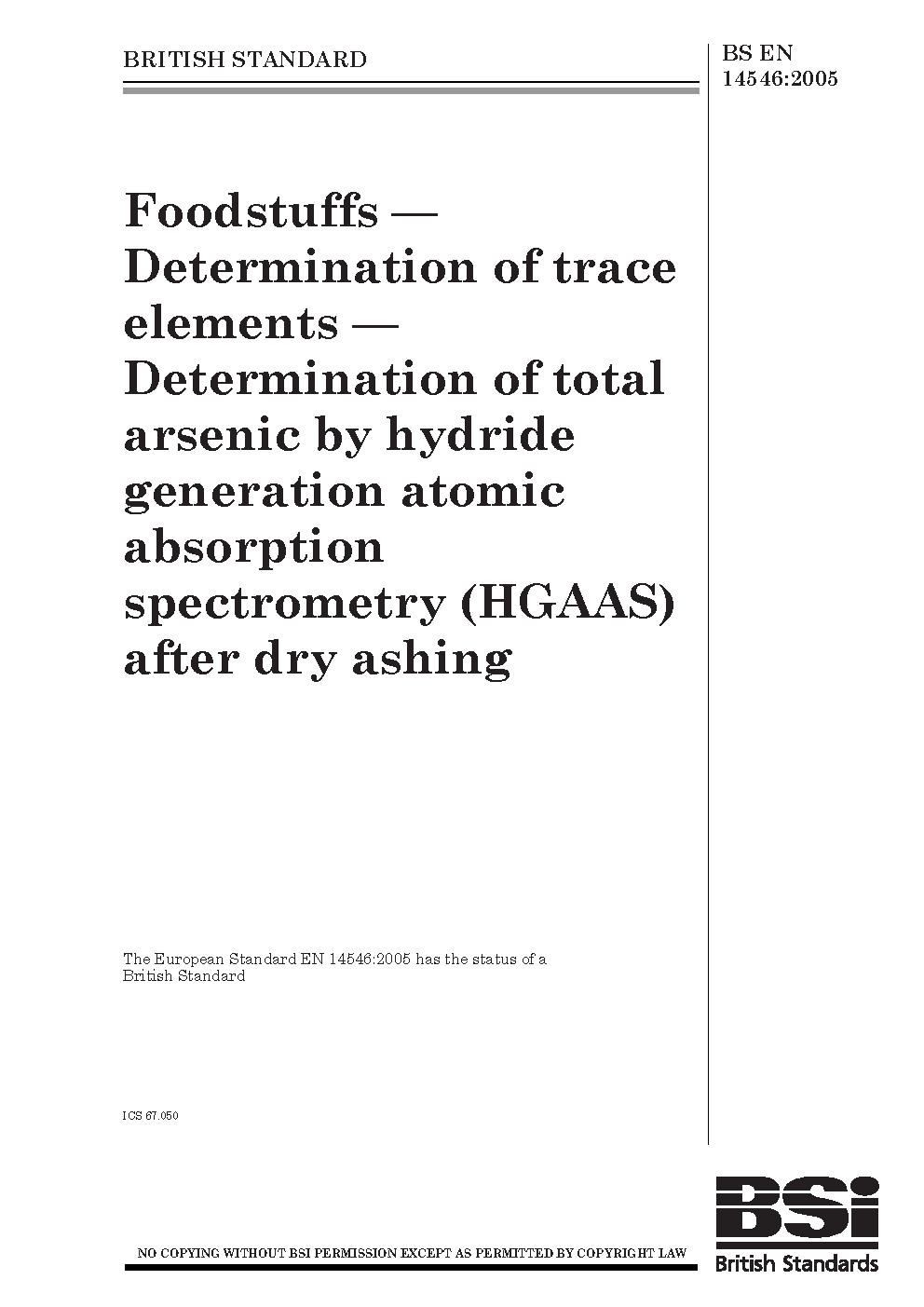 Foodstuffs. Determination of trace elements. Determination of total arsenic by hydride generation atomic absorption spectrometry (HGAAS) after dry ashing