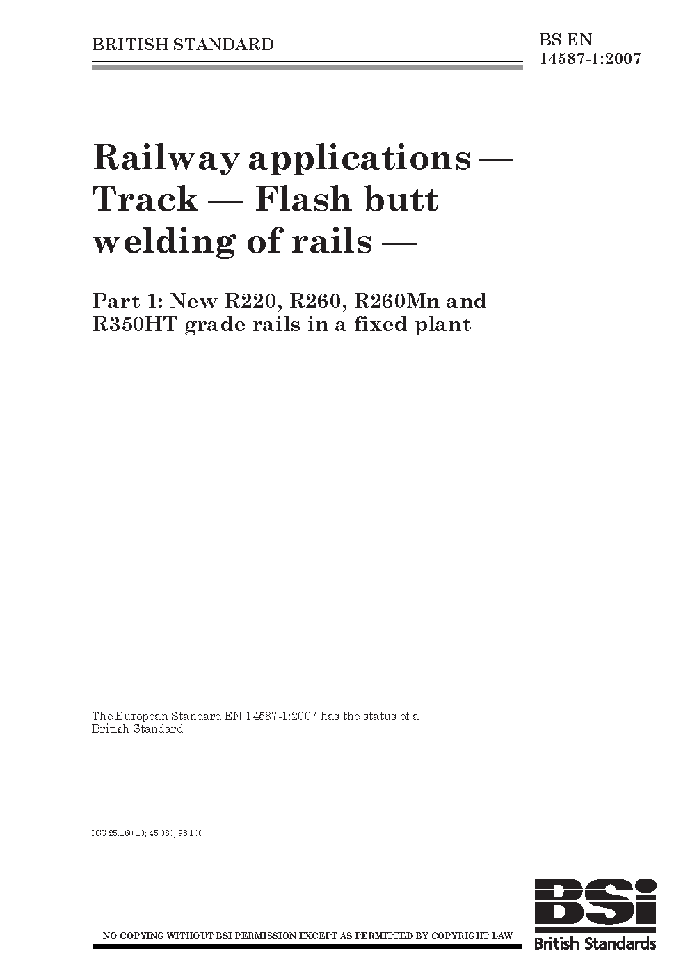 Railway applications. Track. Flash butt welding of rails New R220, R260, R260Mn and R350HT grade in a fixed plant