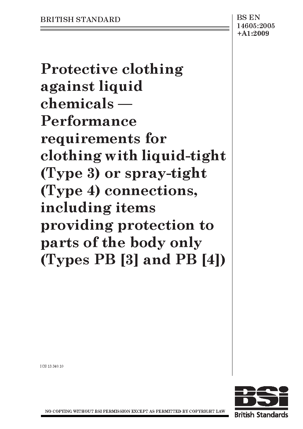 Protective clothing against liquid chemicals. Performance requirements for clothing with liquid-tight (Type 3) or spray-tight (Type 4) connections, including items providing protection to parts of the body only (Types PB [3] and PB [4])