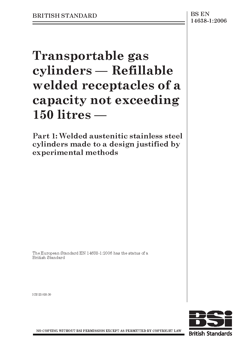 Transportable gas cylinders. Refillable welded receptacles of a capacity not exceeding 150 litres Welded austenitic stainless steel cylinders made to design justified by experimental methods
