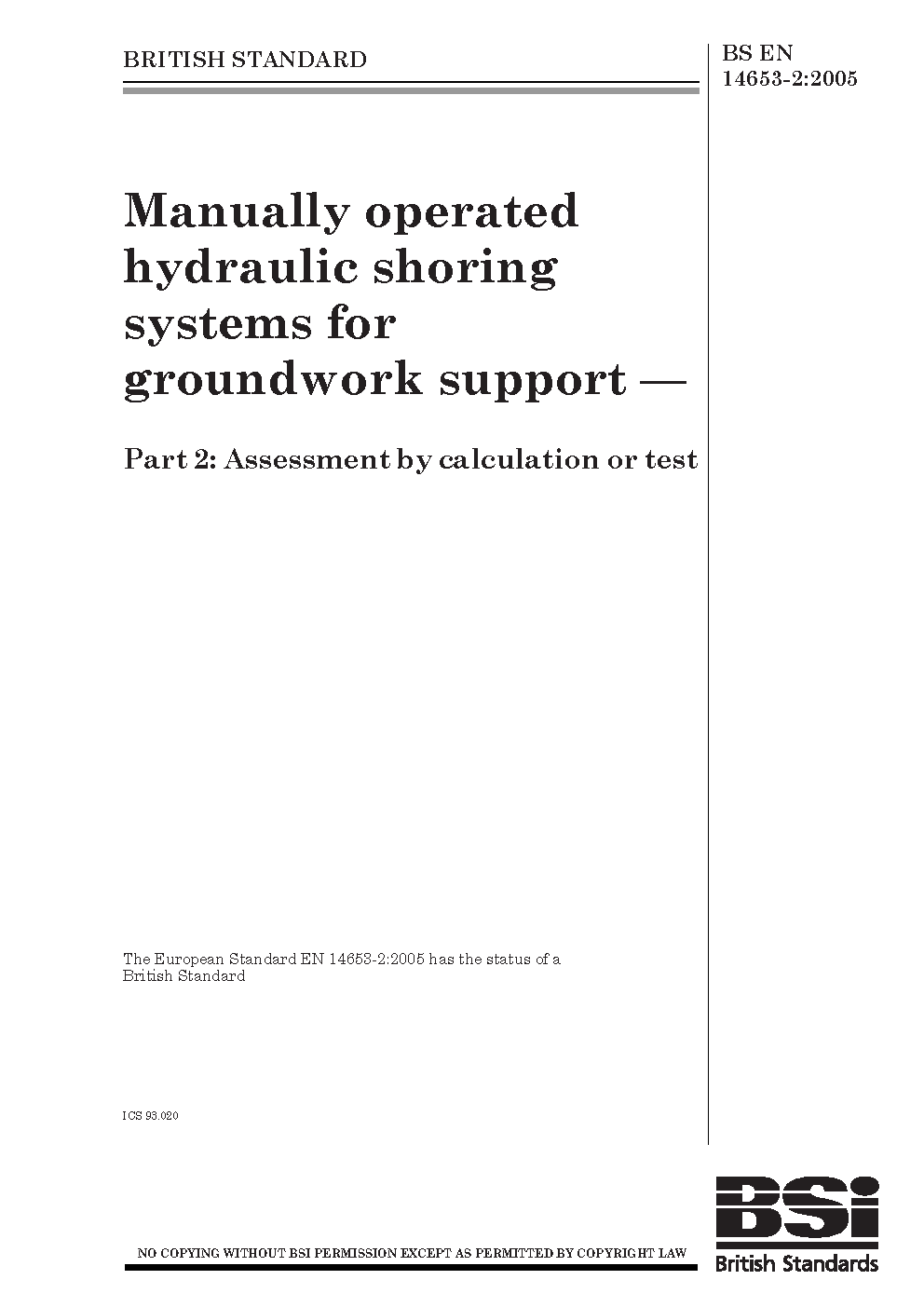 Manually operated hydraulic shoring systems for groundwork support Assessment by calculation or test