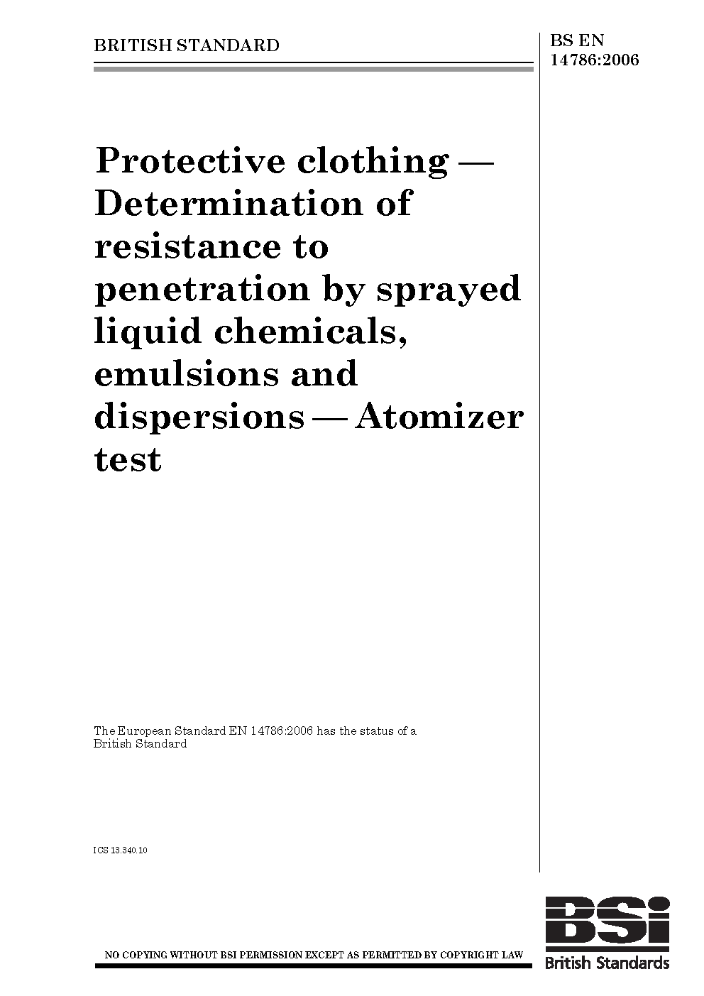 Protective clothing. Determination of resistance to penetration by sprayed liquid chemicals, emulsions and dispersions. Atomizer test