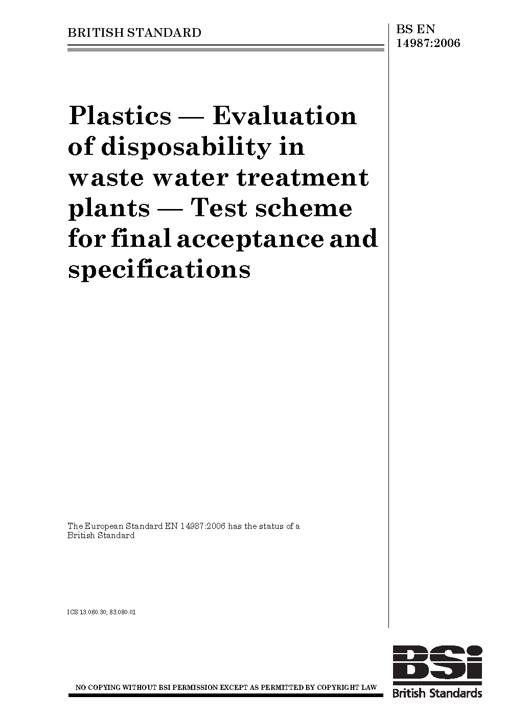Chemical analysis and testing;Solubility;Sewage engineering;Plastics;Waste disposal engineering;Biodegradability;Sewage treatment works;Biodegradable materials;Dispersions (chemical);Solubility test methods;Aqueous extraction methods;Classification systems;Sewage treatment;Verification