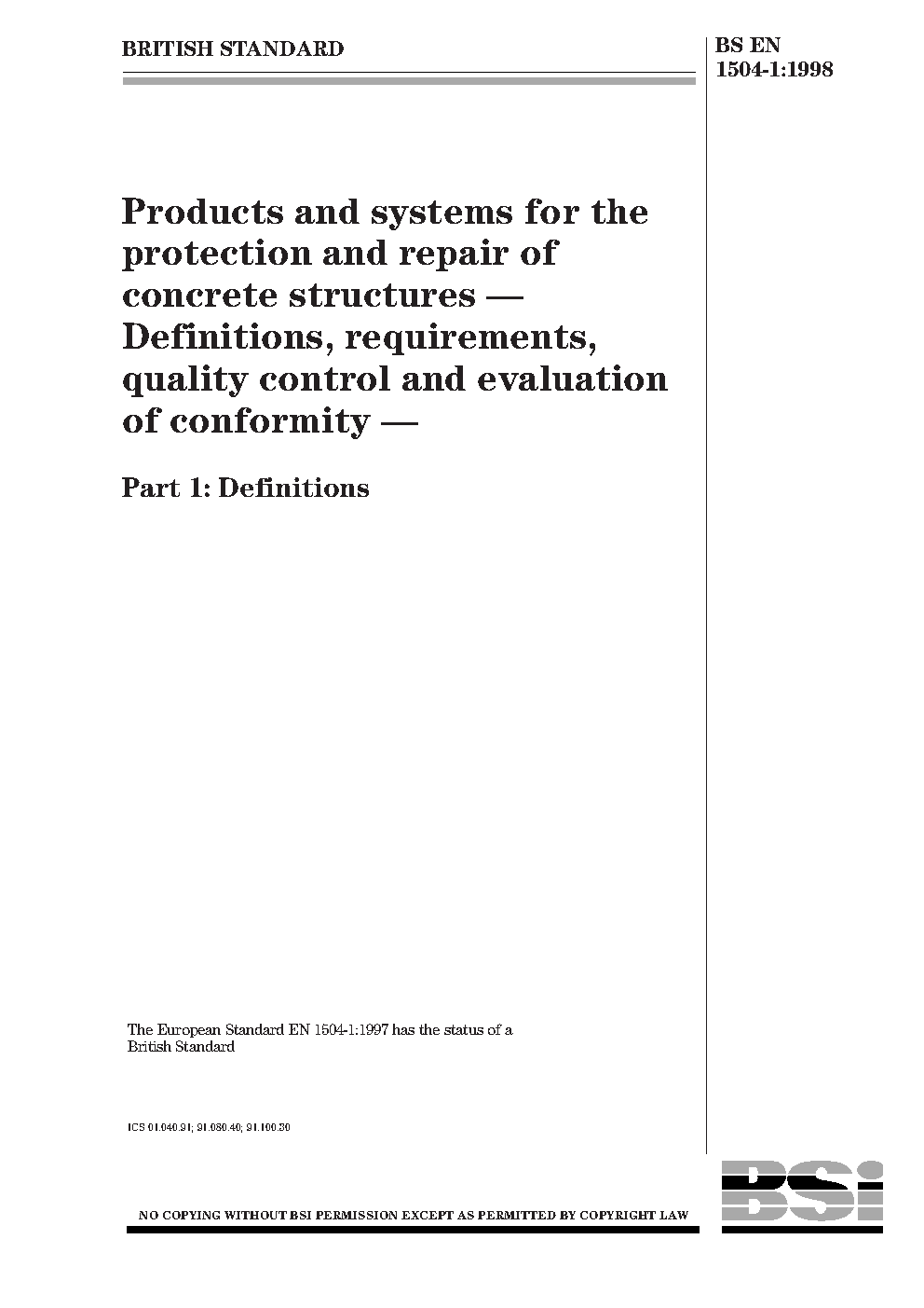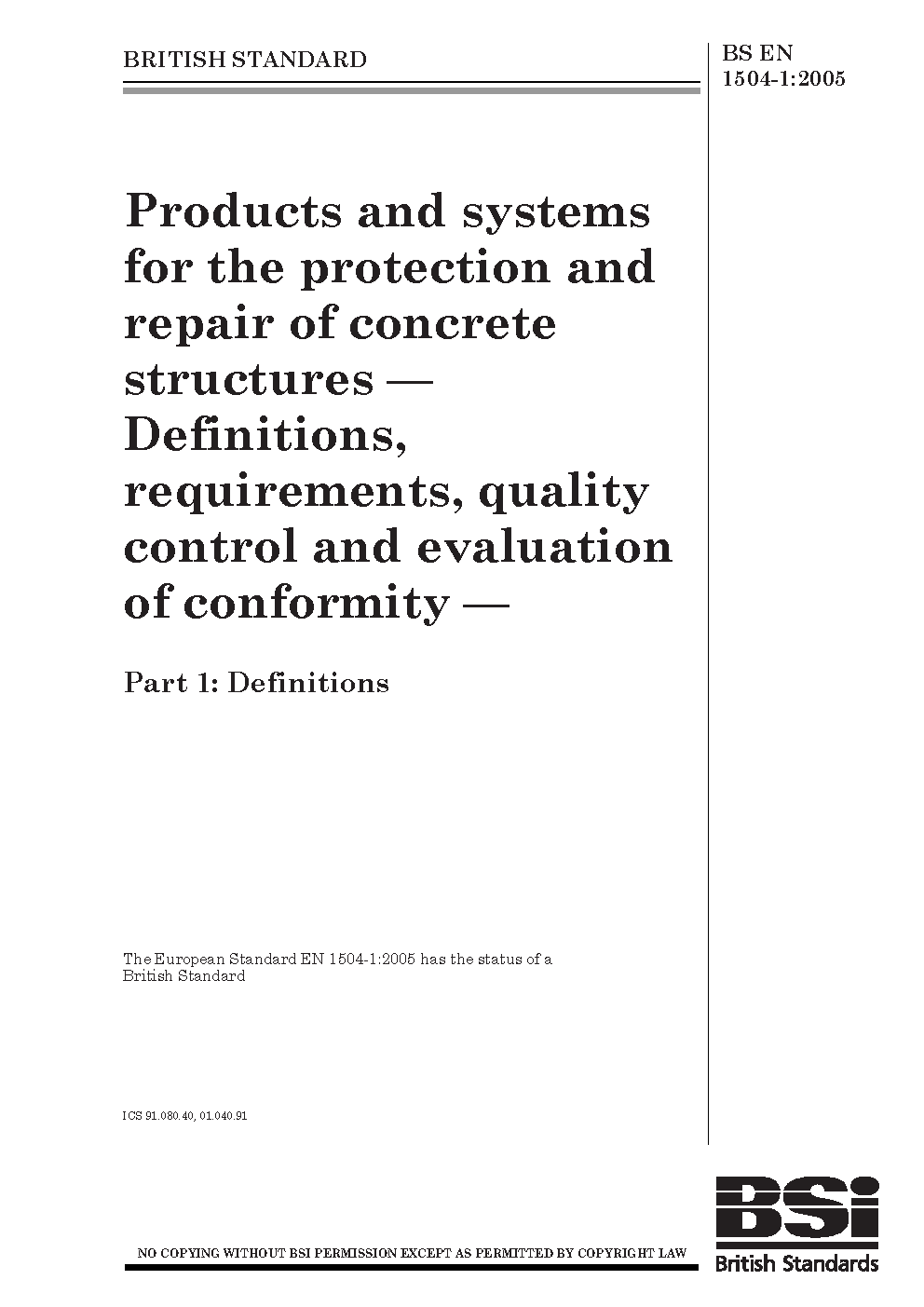Products and systems for the protection repair of concrete structures. Definitions, requirements, quality control andevaluation conformity Definitions