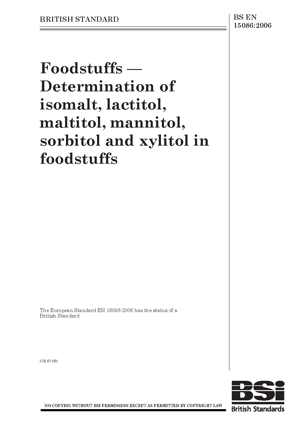 Foodstuffs. Determination of isomalt, lactitol, maltitol, mannitol, sorbitol and xylitol in foodstuffs