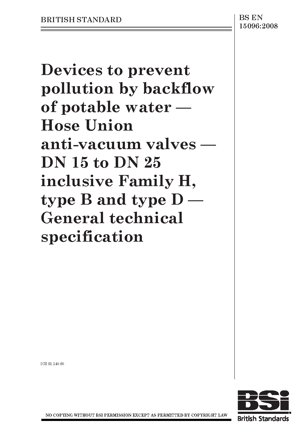Devices to prevent pollution by backflow of potable water. Hose Union anti-vacuum valves. DN 15 to DN 25 inclusive Family H, type B and type D. General technical specification