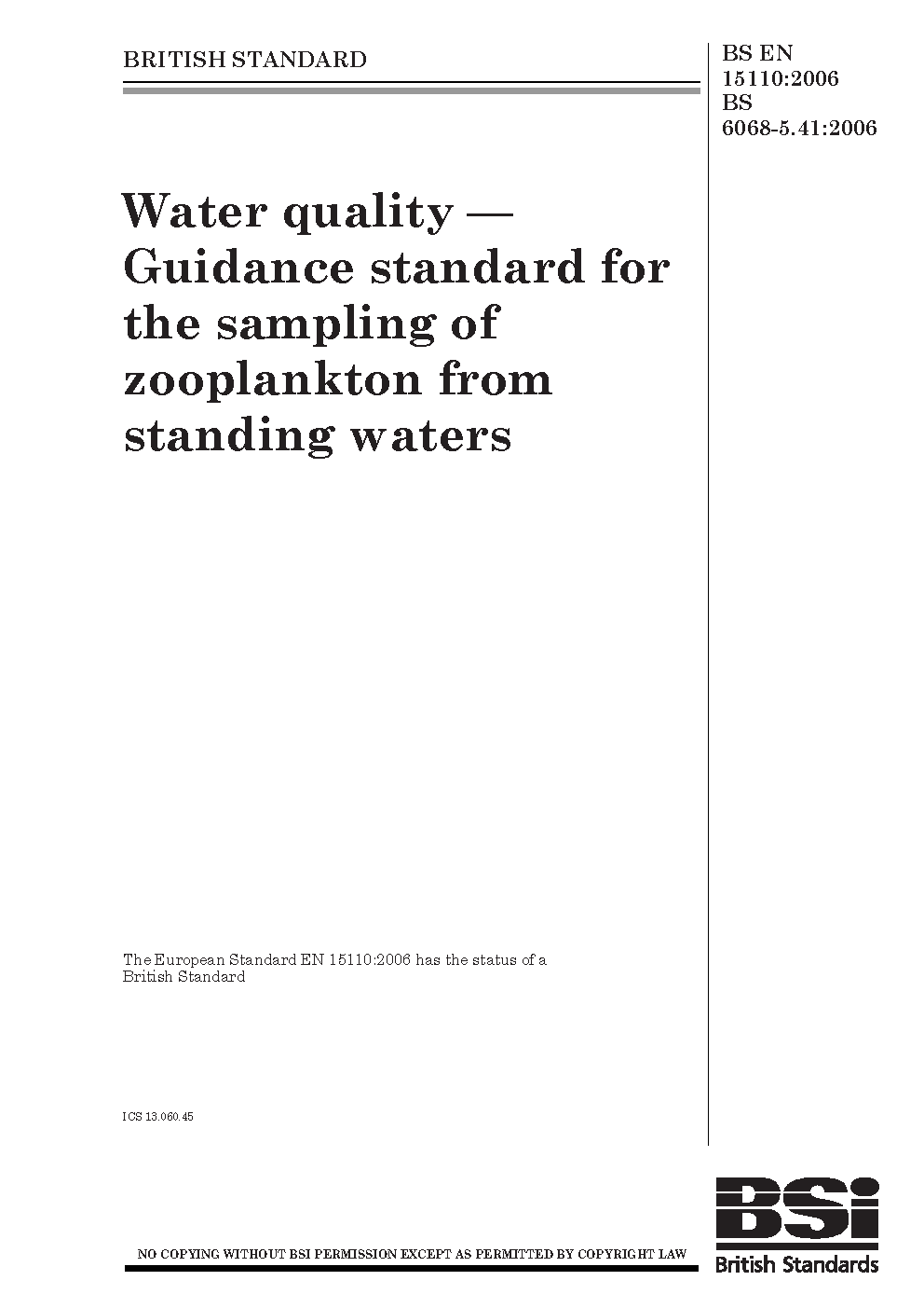 Water quality. Guidance standard for the sampling of zooplankton from standing waters