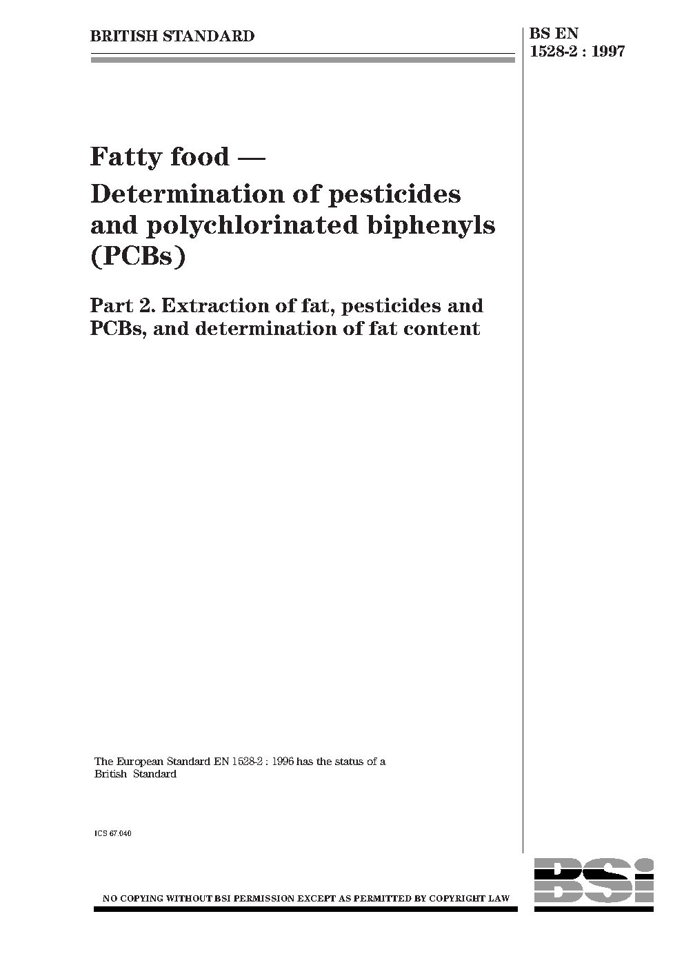 Fatty food. Determination of pesticides and polychlorinated biphenyls (PCBs) Extraction fat, PCBs, determination fat content