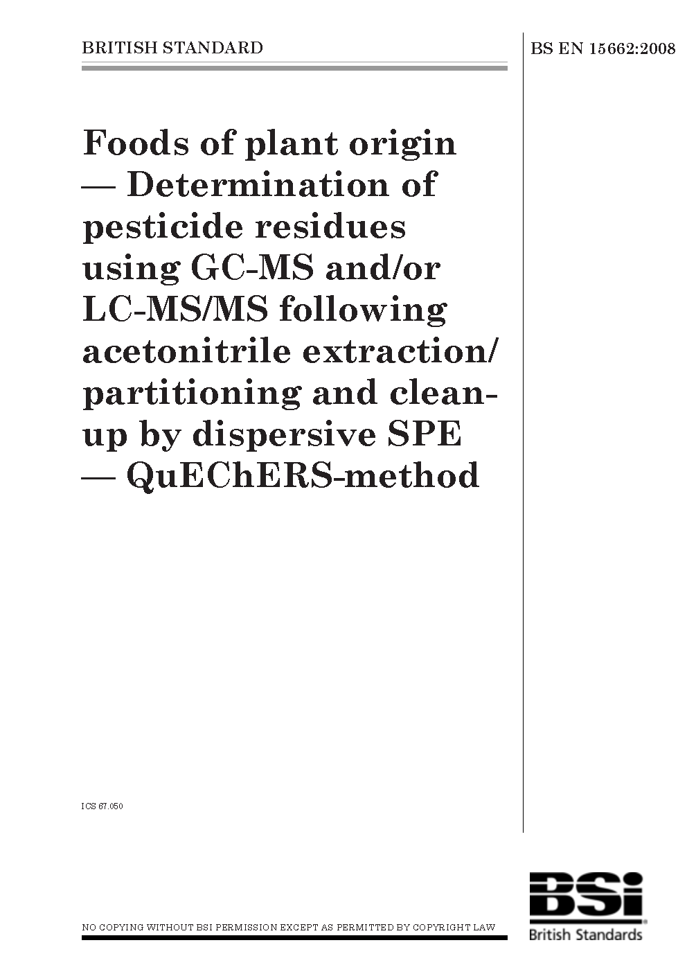 Foods of plant origin. Determination of pesticide residues using GC-MS and/or LC-MS/MS following acetonitrile extraction/partitioning and clean-up by dispersive SPE. QuEChERS-method