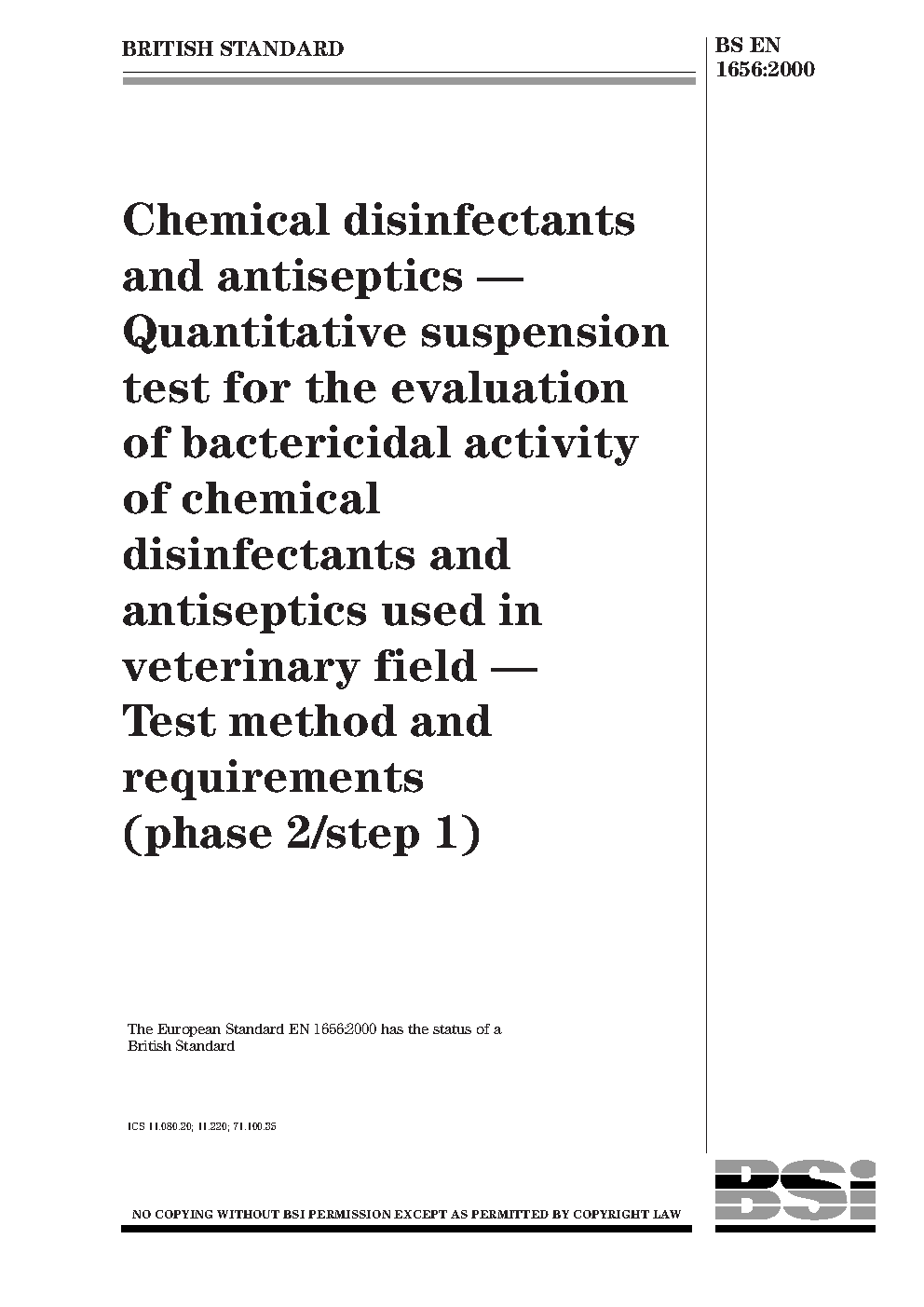 Chemical disinfectants and antiseptics. Quantitative suspension test for the evaluation of bactericidal activity of chemical disinfectants and antiseptics used in the veterinary area. Test method and requirements (phase 2, step 1)