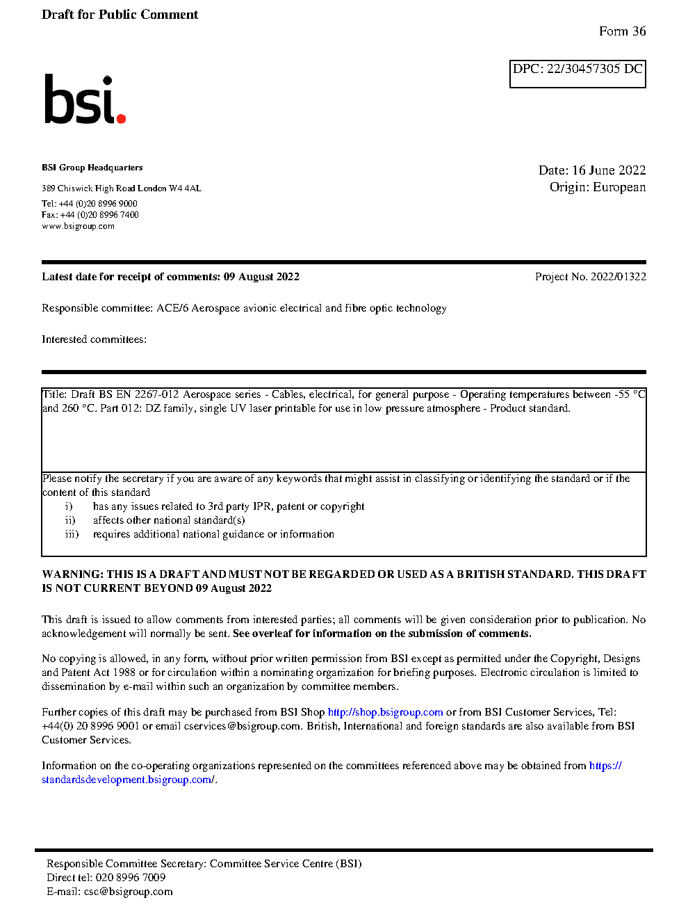 Aerospace series. Cables, electrical, for general purpose. Operating temperatures between -55°C and 260°C DZ family, single UV laser printable use in low pressure atmosphere. Product standard