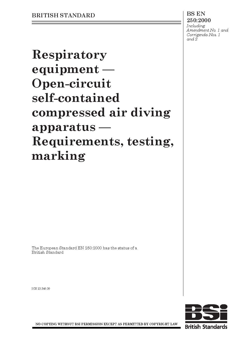 Respiratory equipment. Open-circuit self-contained compressed air diving apparatus. Requirements, testing, marking