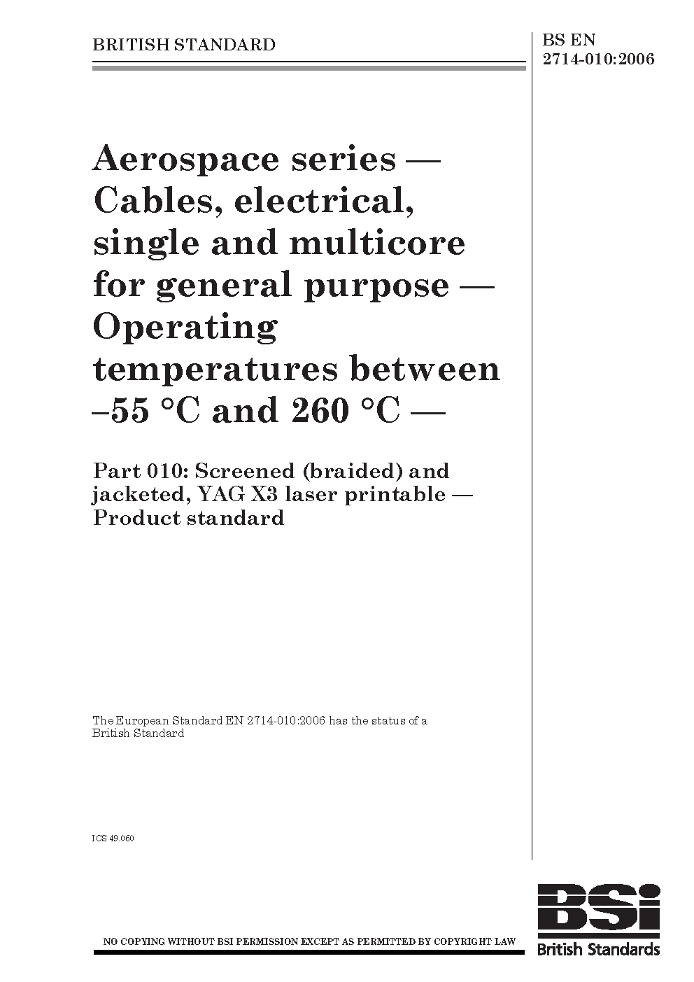 Aerospace series. Cables, electrical, single and multicore for general purpose. Operating temperatures between -55°C 260°C Screened (braided) jacketed, YAG X3 laser Printable. Product standard