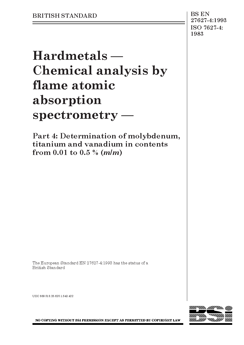Hardmetals. Chemical analysis by flame atomic absorption spectrometry Determination of molybdenum, titanium and vanadium in contents from 0,01 to 0,5 % (m/m)